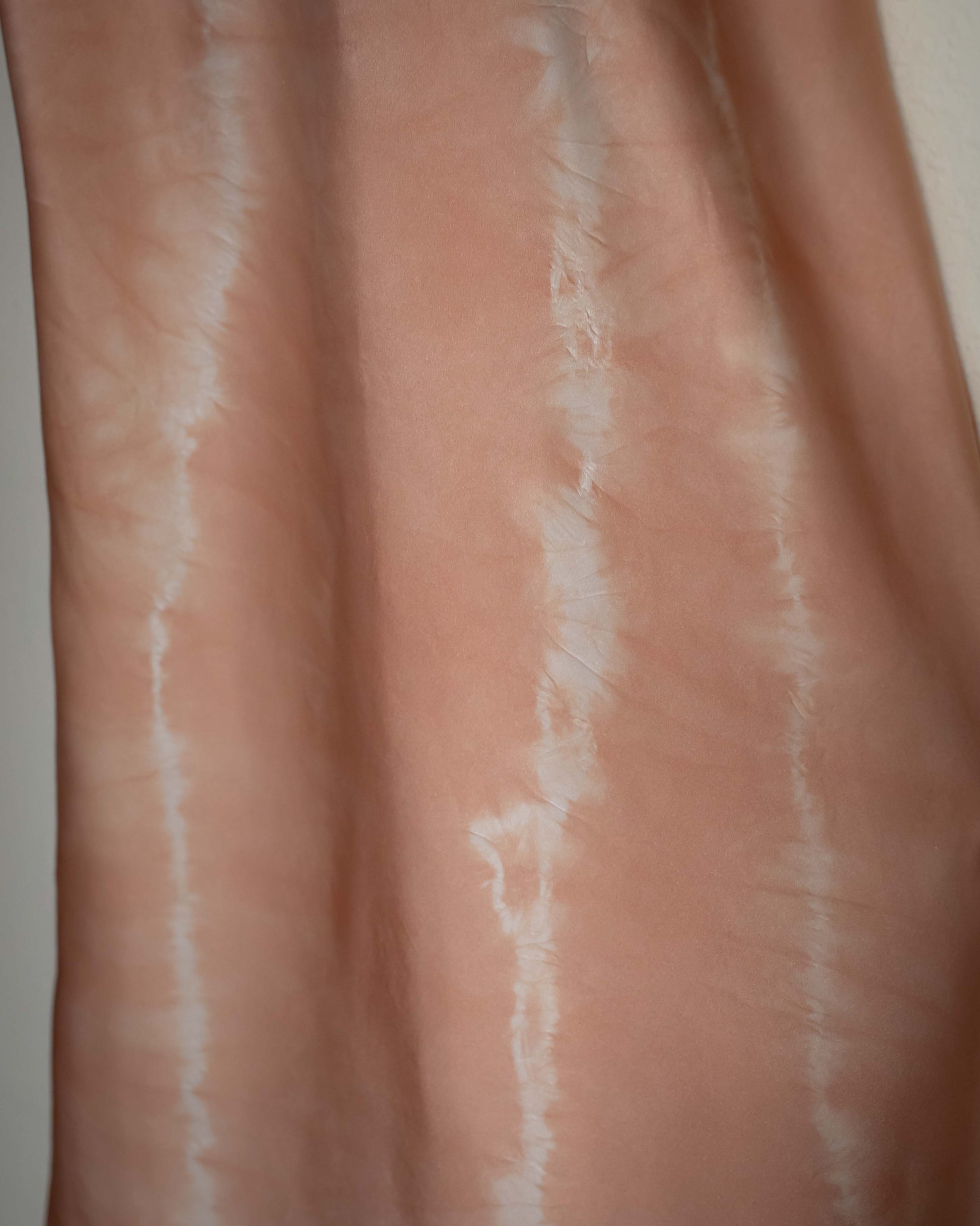 This silk slip dress was dyed with Avocado pits. Some believe the energy of the plant matter is infused into the silk. Spiritually avocados are though thought to represent love, fertility, prosperity, and health. The ancient Aztec culture believed they were a symbol of love and believed them to be an aphrodisiac. This color does feel very romanic to me! (also avocados make every dish more delish!) This design is Shibori - a Japanese dyeing technique that typically involves folding, twisting or bunching cloth and binding it, then dyeing. Traditionally indigo was used for this technique.