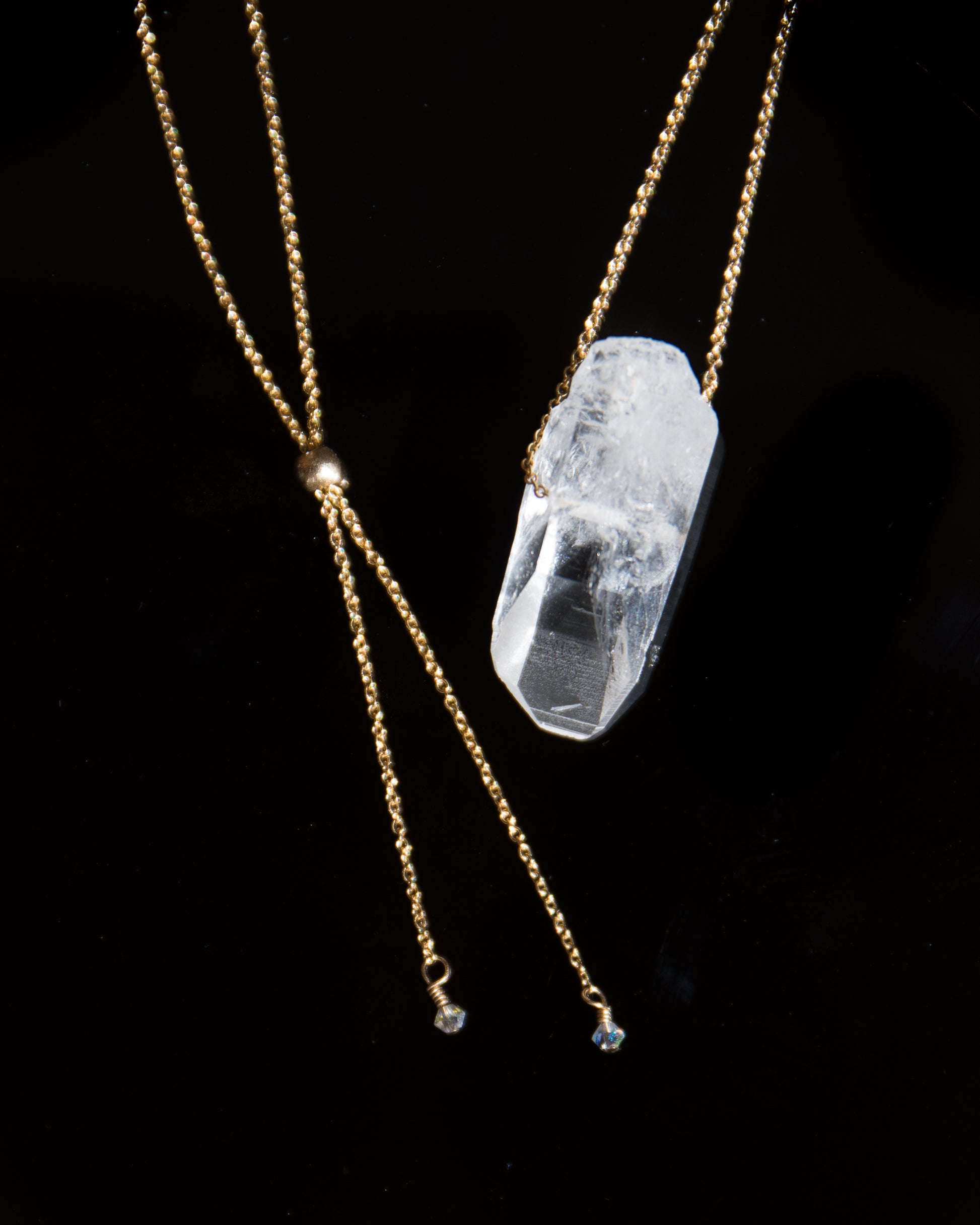 Necklace options are 14K Gold Filled or Sterling Silver chains, each has an adjustable dainty bead to wear at any length up to 30 inches long, with tiny clear quartz details at end. Just gently hold the bead with on hand & the chain with the other to slide & glide it to the length of your choice.
