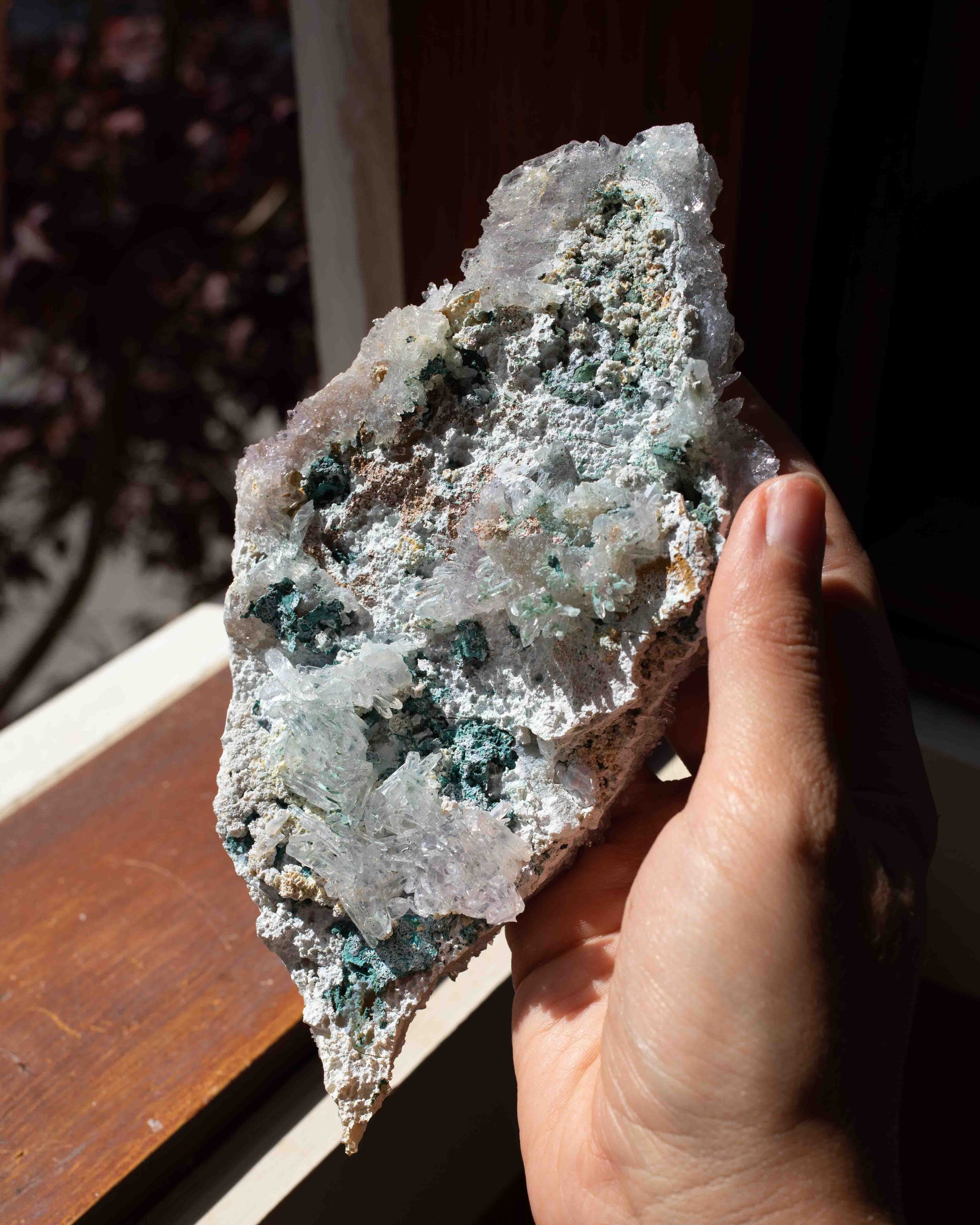 This Amethyst is completely raw from the earth in Brazi. It weighs 9.3 oz and measures about 7 x 4 x 1 inches. I love its super unique color with one half looking more purple and the top looking more blue gray. It is flat plate and perfect for laying on the body during meditation, displaying flat or if you have a small stand (like the one linked here) you can display it upright. It also has clusters on the backside!