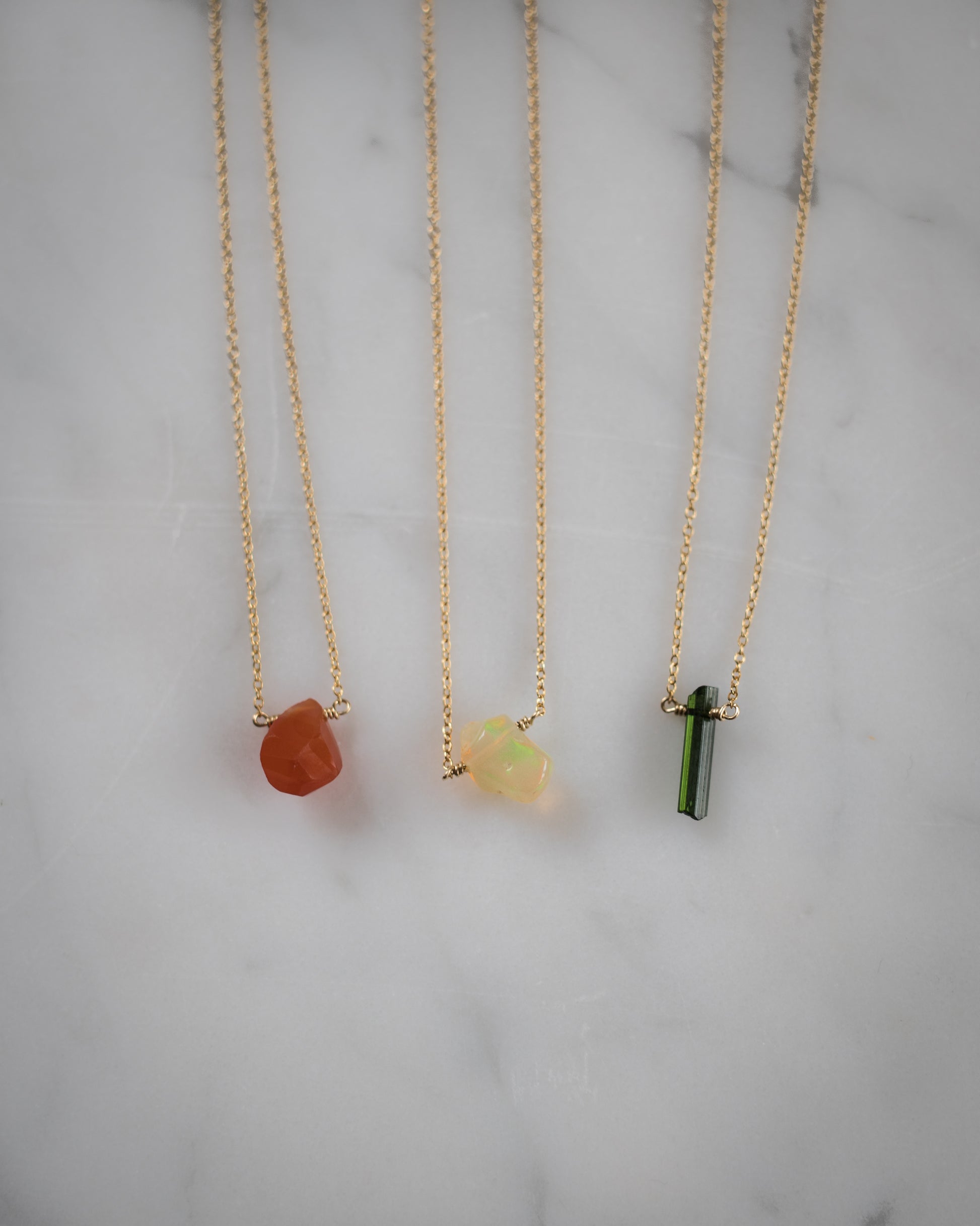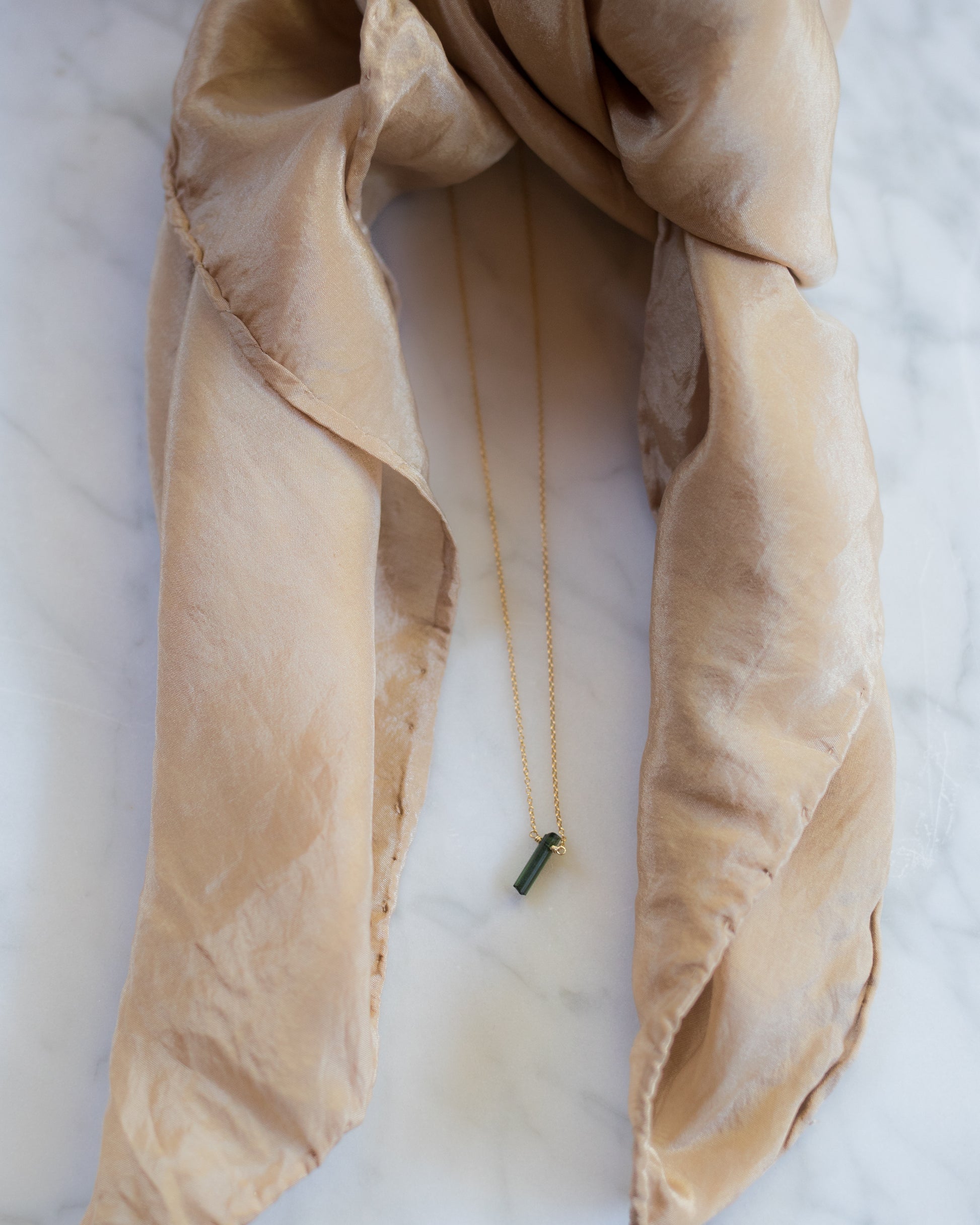 These Green Tourmaline Necklaces were made in collaboration with my Mom and Sister. They are completely natural stones that range in size from 5-10mm long. Photos are an example of what you will receive. The necklace is 16 inches in length and feature our crescent moon clasp, you can add an extender if you'd like here. You can choose from gold filled or sterling silver chain.