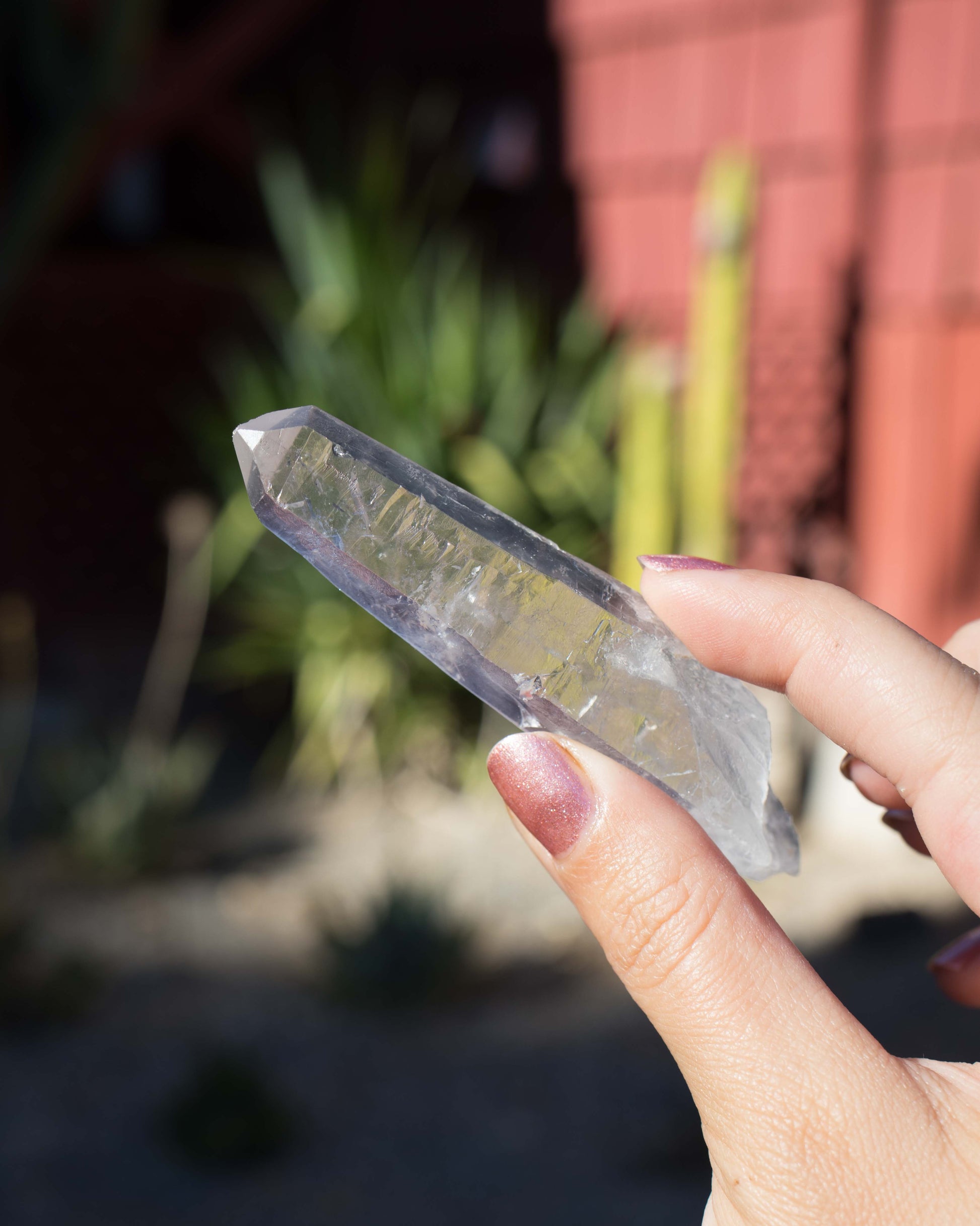 This piece is from Brazil, directly from the earth - no polishing or cutting. It has interesting etchings, and is known as a laser quartz point for its shape with a triangle face on the back. It weighs 1.4oz and measures about 4.75 inches. It is completely raw and does have some nicks and tiny chips around the tip.