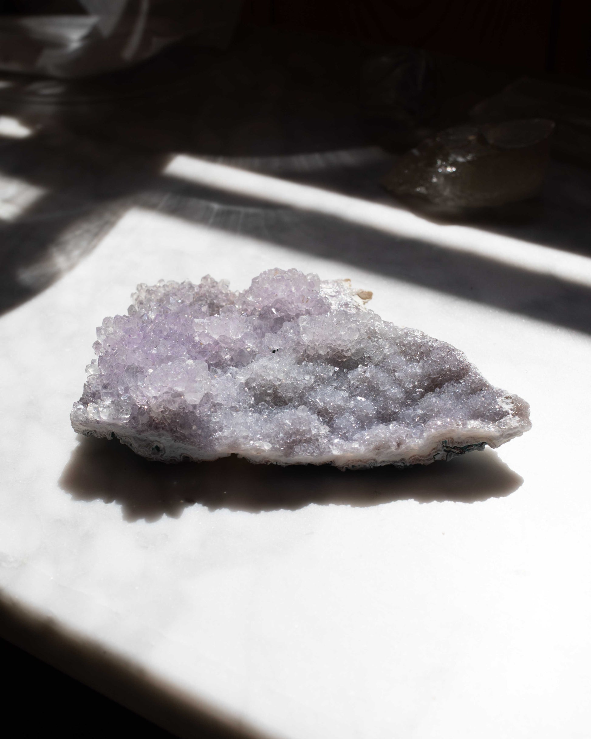 Amethyst is a member of the quartz family and is known to be a balancing & clearing stone. It is said that it can help facilitate the transmission of lower frequency into higher energies & opens up the Third Eye & Crown chakras - perfect for meditation. Emotionally, it is thought to help one find the root of their causes behind certain thought patterns or behaviors such as addictions. Throughout history it has been used to promote sobriety. When it comes to sleep, it is said to be helpful for insomnia & recalling dreams, & is thought to be more powerful if one sleeps in an Amethyst triangle setup. Very frequently, this stone calls to people who are just beginning their work with crystals, but is one that even the most experienced crystal healers hold onto.